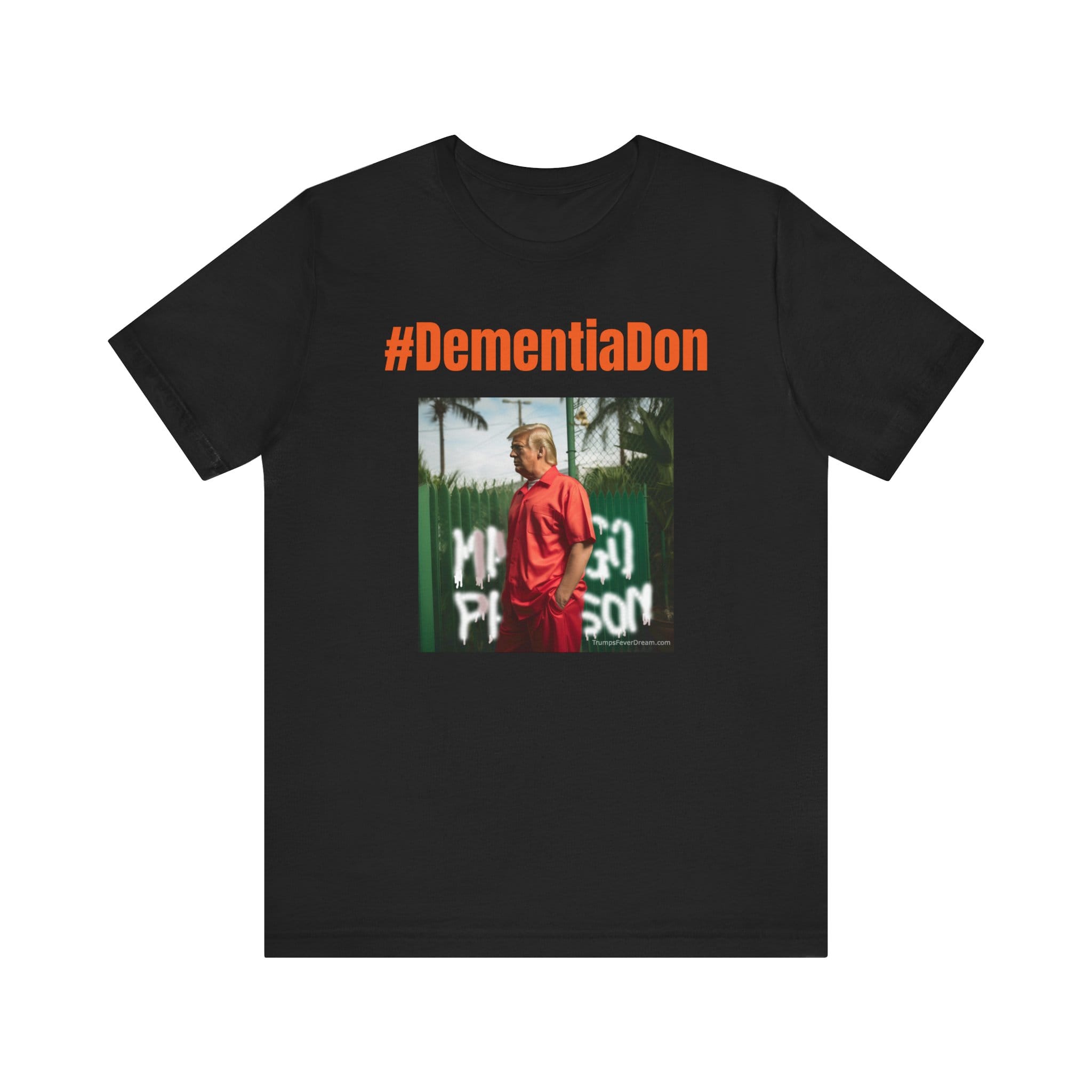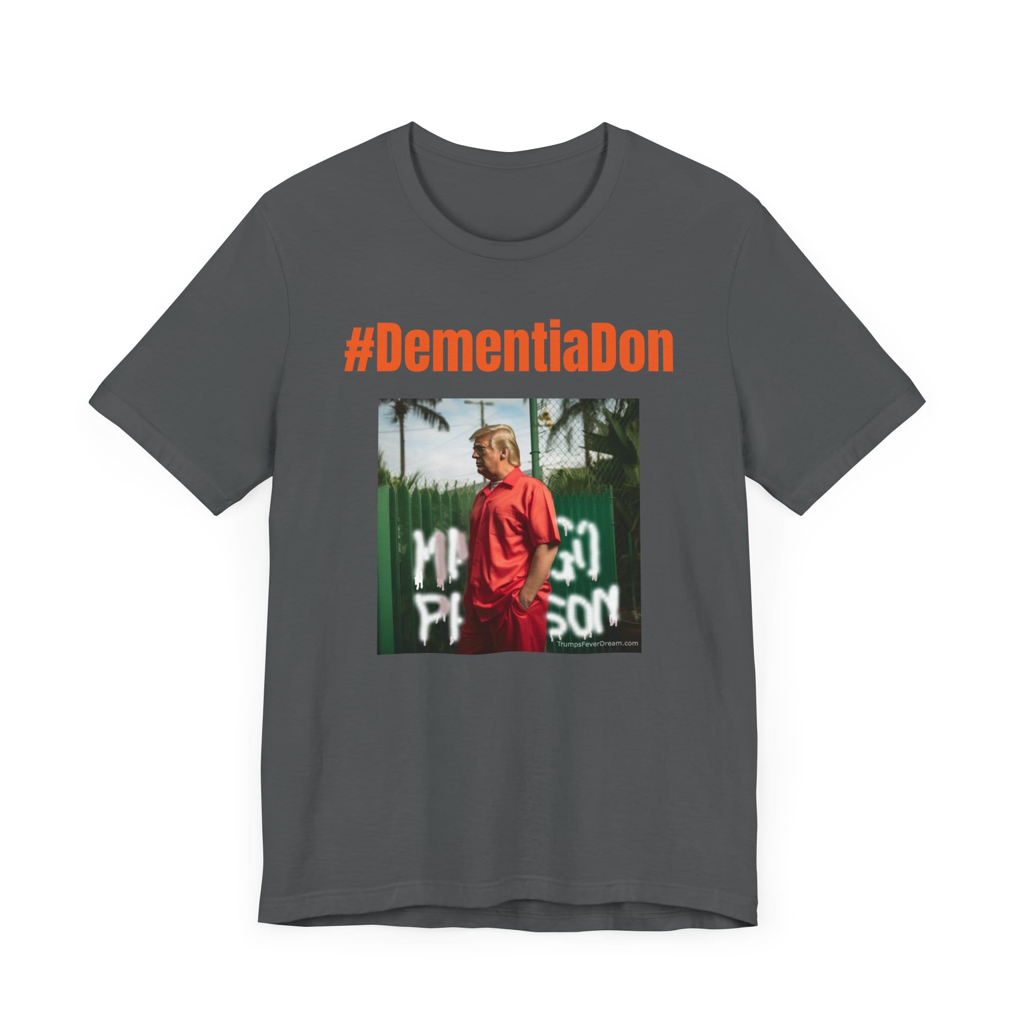 In Season 3, Episode 5, Trump wins the 2024 election on the same day he’s convicted of orchestrating the Jan. 6th insurrection and President Biden surrounds Mar-A-Lago with a prison fence and guard towers while a CIA/Homeland Security Joint Task Force try to uncover the Russian hack of the election before Trump’s inauguration. This #DementiaDon episode Commemorative tee features Trump in orange-silk prison pajamas near the graffiti ‘Mar-A-Lago Prison.’ This episode was inspired by hashtag #DementiaDon trending for weeks on X, formerly known as Twitter, before Musk’s folly became the cyber battleground of the cold civil war. Available in 5 colors: White, Asphalt, Black, Brown or Olive, this classic short sleeve tee fits like a well-loved favorite. It’s soft cotton, quality graphics, and quality construction will wear to a well-loved, better fit over time. Help spread the word about “#DementiaDon.
